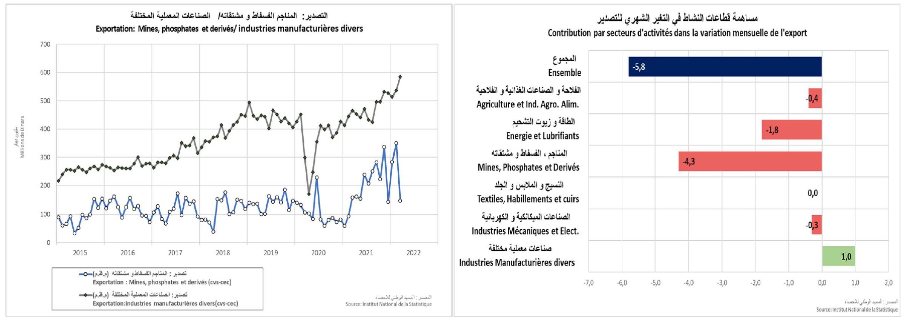 و قد شمل هذا التراجع في الصادرات معظم قطاعات نذكر بالخصوص قطاع استخراج الفسفاط ومشتقاته ، حيث بعد تسجيله زيادات مهمة في جانفي 98٪ و 23٪ في فيفري، انخفضت صادراته بنسبة 58٪ فى شهر مارس.