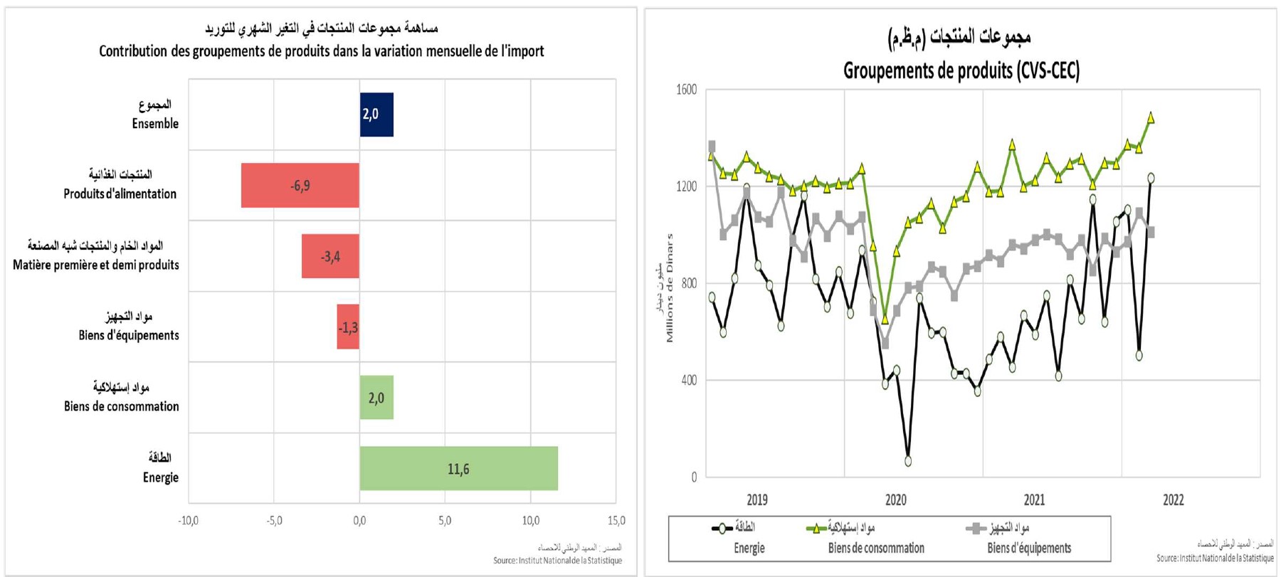 هذا التطور هو نتيجة لزيادة المسجلة في الواردات من منتجات الطاقة بنسبة + 145.1٪ ، و المشتريات من المواد الاستهلاكية بنسبة 9.2٪ فى المقابل انخفاض واردات منتجات الغذائية (-47.9٪)، و المواد الخام والمنتجات شبه المصنعة (-8.8٪) مواد التجهيز (-7.3٪).