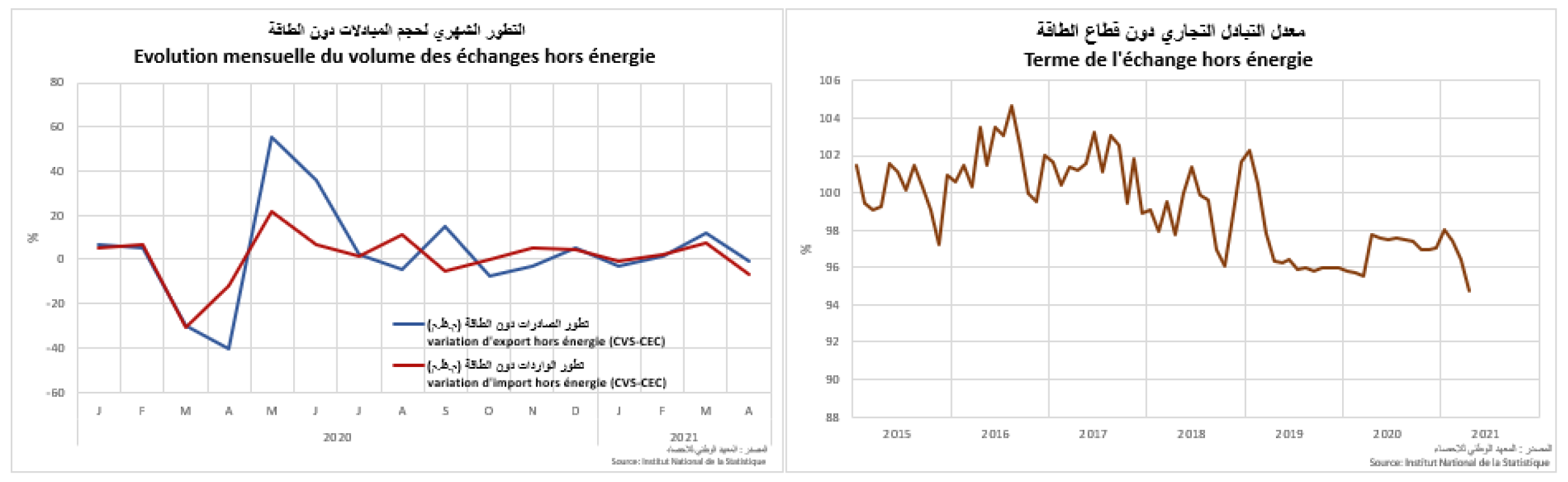 بعد شهرين من التطور الإيجابي، تتراجع المبادلات التجارة دون الطاقة في شهر أفريل بنسب متفاوتة ، حيث انخفضت الواردات بالنسبة (-6.4٪) بينما انخفضت الصادرات بنسبة (-1.1٪) فقط.