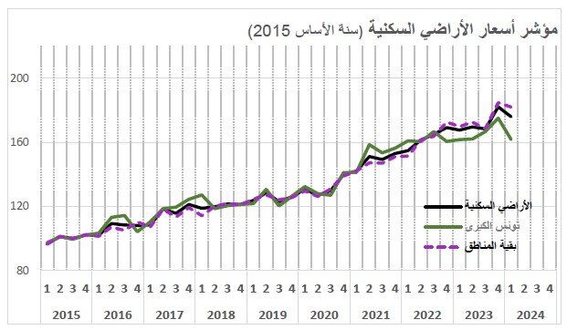 انخفض الرقم القياسي لأسعار أراضي البناء على المستوى الوطني بنسبة 3.4%، مقارنة بالربع الأخير من سنة 2023. وتجدر الإشارة إلى أن هذا الانخفاض قد بلغ 5.8% بالنسبة للمناطق الساحلية (نابل وسوسة والمهدية والمنستير) وبلغ 2% بالنسبة لبقية التغطية الجغرافية للمؤشر.