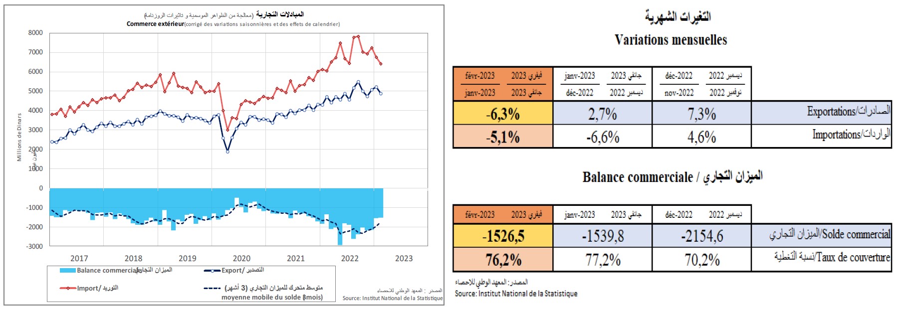 Le déficit commercial mensuel au mois de février 2023 est quasiment stable à un niveau de 1526,5 MD contre 1539.8 MD en janvier.