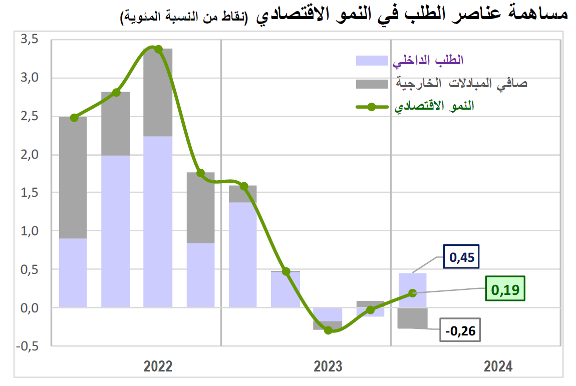 وقد ارتفع حجم الطلب الداخلي بنسبة سنوية قُدِّرَت بـ 0,4 بالمائة، ليظل بالتالي الدافع الأساسي لمسار النمو مساهما إيجابيا بـ 0,45 نقطة مئوية في نسبة النمو المسجلة (0,2). في حين ساهمت المبادلات الخارجية من السلع والخدمات سلبيا بـ -0,26 نقطة.