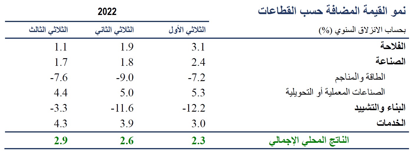 أبرزت التقديرات الاولية للحسابات القومية الثلاثية أن النشاط الاقتصادي قد سجل نموا في حجم الناتج المحلي الإجمالي (المعالج من تأثير التغيرات الموسمية) بنسبة بلغت 2.9 بالمائة خلال الثلاثي الثالث من سنة 2022، وذلك مقارنة بنفس الثلاثي من سنة 2021، أي من منظار قياس النمو بحساب الانزلاق السنوي، في تدرج ايجابي مقارنة بالربعين السابقين (على التوالي 2.3٪ و2.6٪). ويرجع هذا النمو الاقتصادي الكلي بالأساس إلى ارتفاع نسق نمو القيمة المضافة في قطاع الخدمات، والذي بلغ 4.3% على أساس سنوي، وبدرجة أقل إلى تقلص التراجع في قطاع البناء والتشييد.