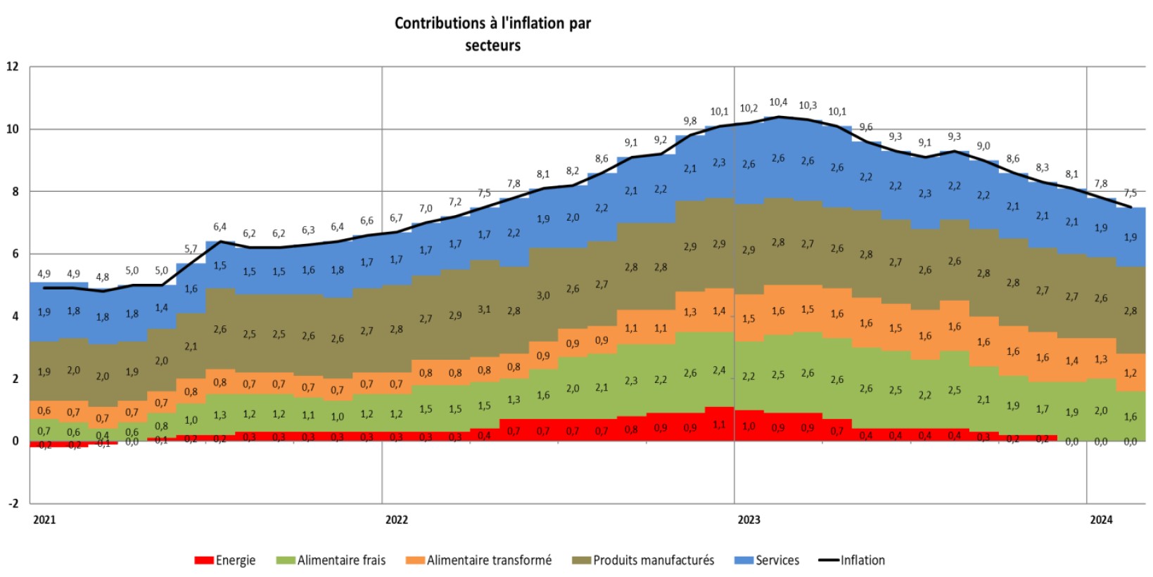 تبقى نسبة التضخم عند الاستهلاك في منحى تنازلي وقد سجلت تراجعا الى مستوى 7,5% بعد ان كانت في حدود 7,8% خلال شهر جانفي. ويعود هذا التراجع رغم الزيادة المسجلة على مستوى الشهري لتقلص نسق الزيادة في الأسعار بين شهري فيفري 2024 وجانفي 2024 بالمقارنة بنفس الفترة من السنة الفارطة.