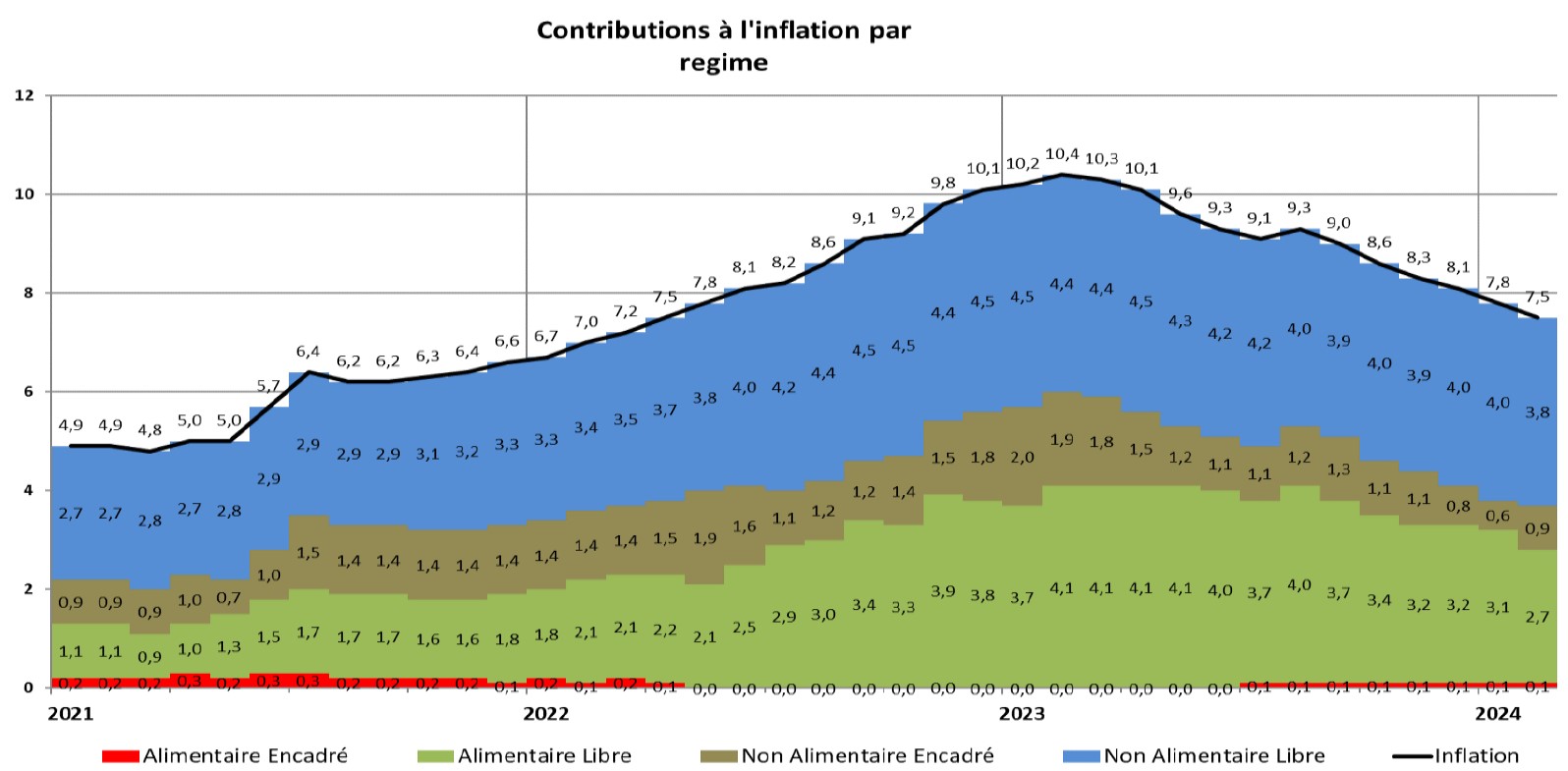 ساهمت مجموعة " المواد غير الغذائية الحرة " ومجموعة "المواد الغذائية الحرة" بأعلى نسبة في التضخم قدرت على التوالي بنسبة 3,8% و2,7%، في حين ساهمت مجموعة " المواد الغذائية المؤطرة" بأدنى نسبة قدرت بـ 0,1%.