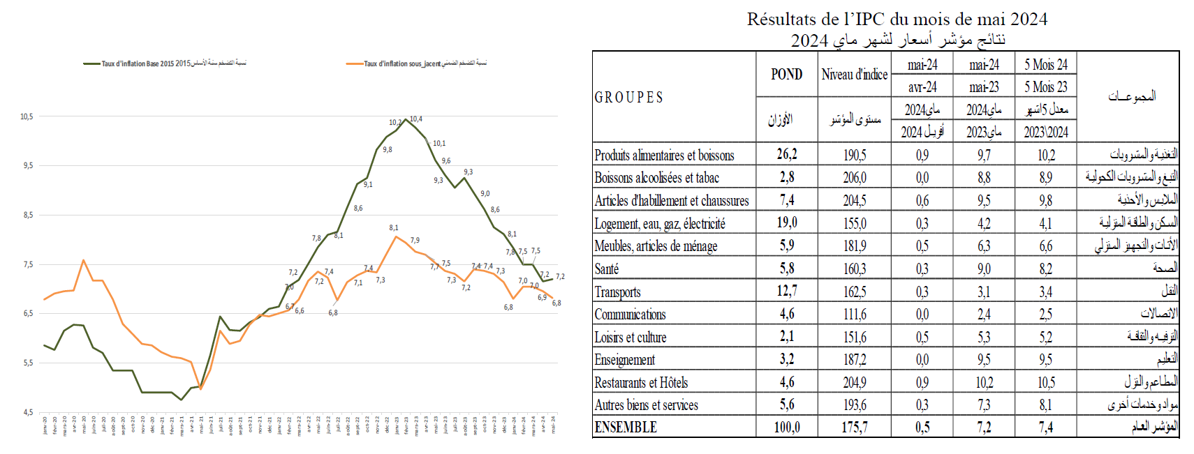 شهد مؤشر أسعار الاستهلاك خلال شهر ماي 2024 ارتفاعا بنسبة 0,5%، بعد الارتفاع بنسبة 0,9% خلال شهر أفريل 2024.