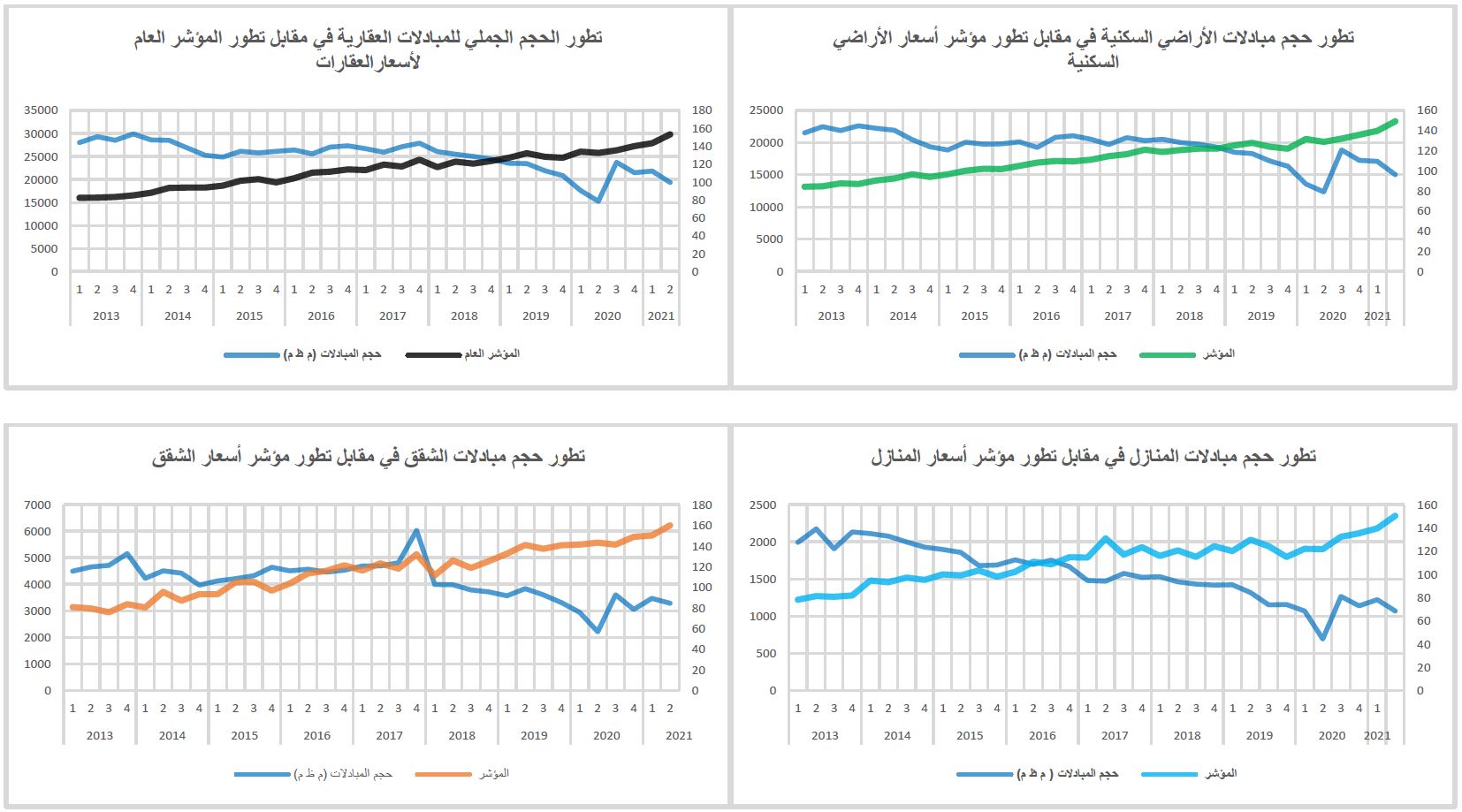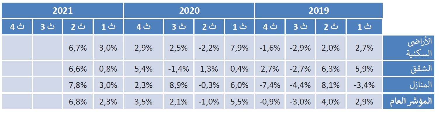 سجل المؤشر العام لأسعار العقارات خلال الثلاثي الثاني من سنة 2021 ارتفاعا بنسبة 15,4% وذلك مقارنة بنفس الفترة من السنة الماضية حيث سجلت أسعار الشقق ارتفاعا بنسبة 11,6% (7,7%+ كمعدل مسجل خلال الست السنوات الماضية 2015-2020) وأسعار المنازل ارتفاعا بنسبة 23,7% (5,1% كمعل للفترة 2015-2020) وأسعار الأراضي المعدة للسكن ارتفاعا بنسبة 15,9% (5,7% كمعدل للفترة 2015-2020).