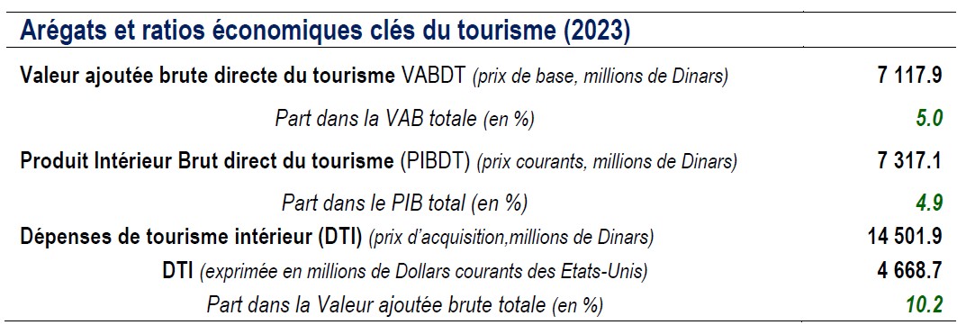 La production totale des activités touristiques en 2023 est estimée à 24 717,1 millions TND, avec une valeur ajoutée brute (VAB) de 13 717,9 millions TND après déduction de la consommation intermédiaire, ce qui permet de calculer une contribution de la valeur ajoutée des industries touristiques à l'économie tunisienne de 9,6 %. Il convient de noter que ce chiffre ne représente pas à ce stade la contribution du tourisme au Produit Intérieur Brut PIB, car il n'inclut pas la consommation par les visiteurs de biens et services qui ne sont pas classés comme des produits caractéristiques du tourisme (tels que les services de commerce de gros et de détail et autres services), et en revanche il intègre également la consommation de biens et services des industries caractéristiques du tourisme mais des non-visiteurs (par exemple, les résidents de la Tunisie qui ne sont pas en voyage touristique).