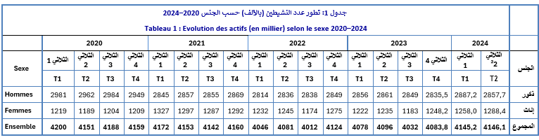 Cette baisse de la population active pendant le deuxième trimestre de l’année 2024 correspond à une baisse de 0,3 point de pourcentage du taux d’activité qui atteint 46,0 % de la population en âge d’activité (âgée de plus de 15 ans) contre 46,3 % le trimestre précédent.