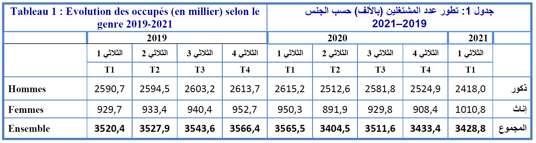 Au premier trimestre 2021, le nombre des occupés s’établit à 3428.8 mille contre 3433.4 mille au quatrième trimestre de 2020, soit une diminution de 4.6 mille.