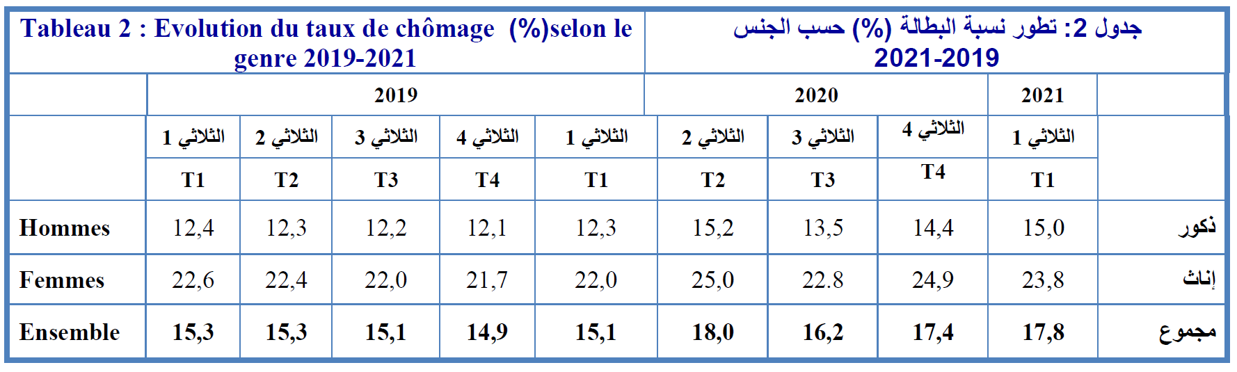 Au premier trimestre 2021, le taux de chômage a évolué comme suit selon le genre : augmentation de 0.6 point pour les hommes et diminution de 1.1 point pour les femmes, pour atteindre, respectivement, 15.0% et 23.8%.